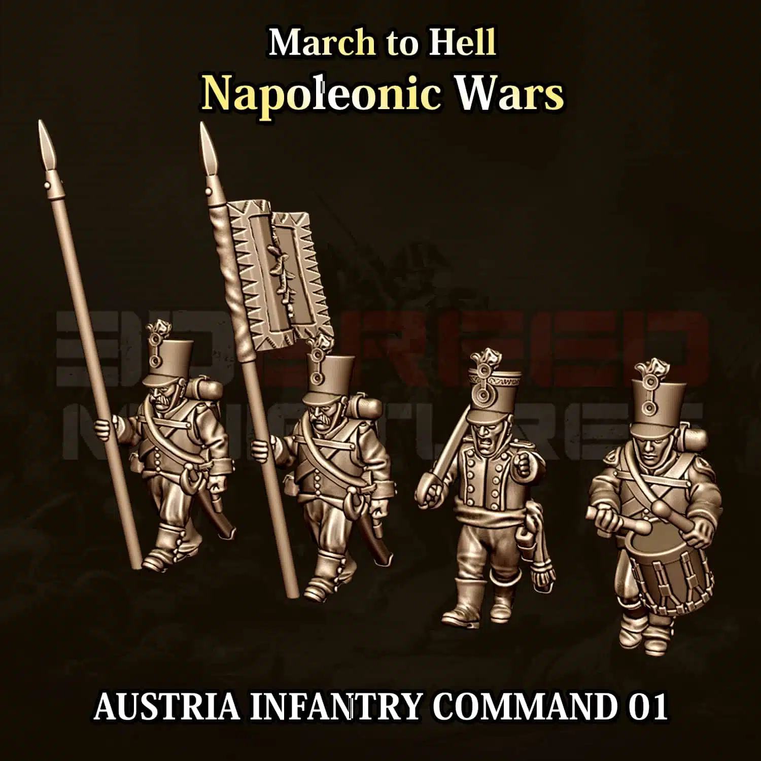 Imprimées en résine Ameralabs TGM-7 haute qualité, avec une précision de 0,035 mm, elles reproduisent fidèlement les uniformes blancs, les shakos noirs et l’équipement détaillé des soldats impériaux.
