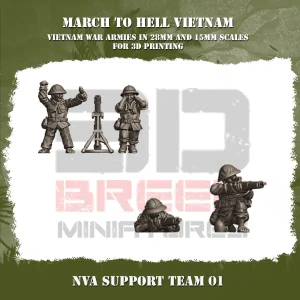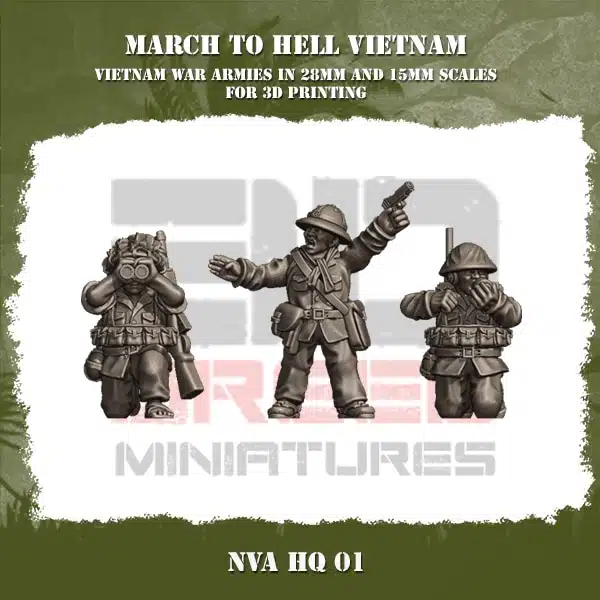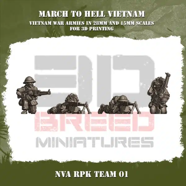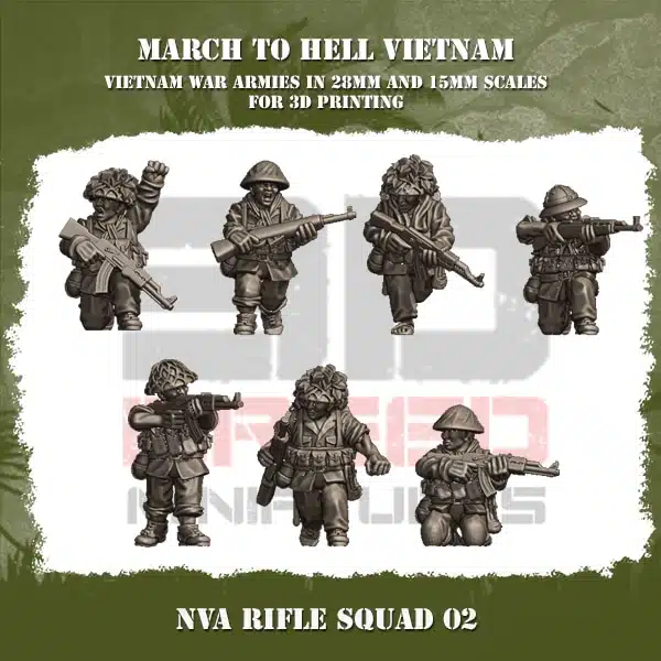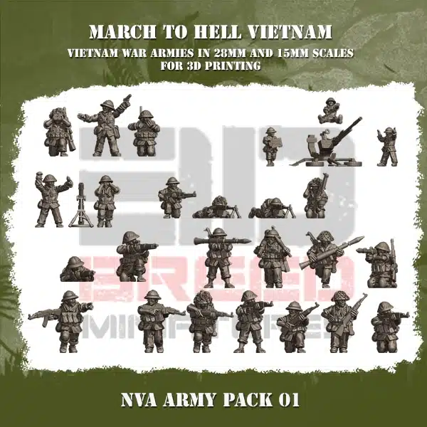 Ce set comprend 25 figurines (Sets commandement 1, escouade fusil 1, support, RPG, ZPU, RPK) idéales pour vos armées de la guerre du Vietnam, reconstitutions historiques ou scénarios de jeux de rôle militaires. Compatibles avec de nombreux wargames modernes ou historiques. Imprimées en résine Ameralabs TGM-7 haute qualité, précision 0,035 mm, offrant un rendu net et des détails réalistes.